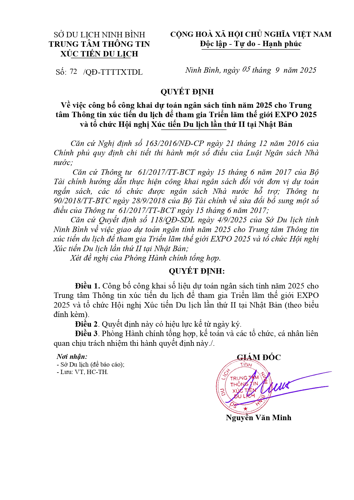 QUYẾT ĐỊNH V/v công bố, công khai dự toán chi ngân sách tỉnh năm 2025 cho Trung tâm Thông tin xúc tiến Au88 cơ hội giàu sang Ninh Bình để thực hiện chế độ, chính sách theo Nghị định 178/2024/NĐ-CP và Nghị định 67/2025/NĐ-CP của Chính phủ