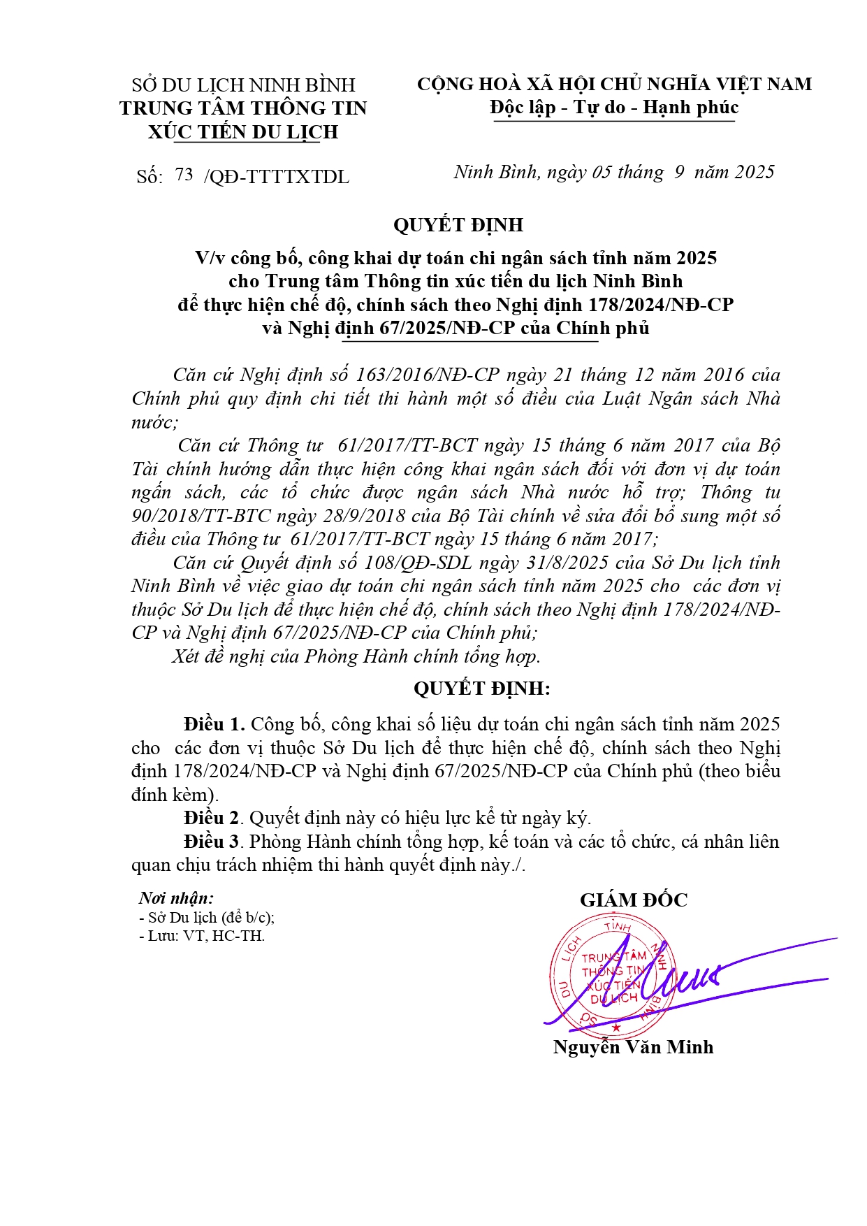 QUYẾT ĐỊNH V/v công bố, công khai dự toán chi ngân sách tỉnh năm 2025 cho Trung tâm Thông tin xúc tiến Au88 cơ hội giàu sang Ninh Bình để thực hiện chế độ, chính sách theo Nghị định 178/2024/NĐ-CP và Nghị định 67/2025/NĐ-CP của Chính phủ