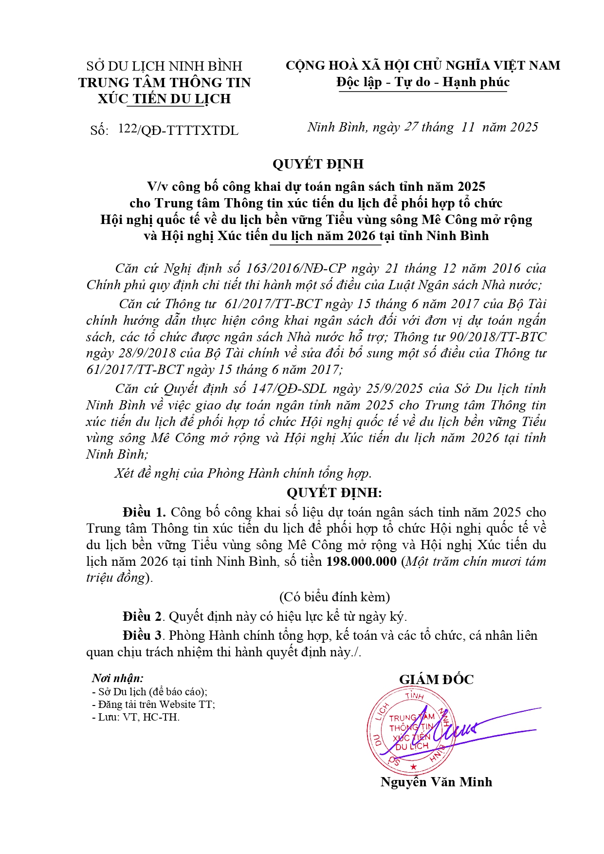 QUYẾT ĐỊNH V/v công bố, công khai dự toán chi ngân sách tỉnh năm 2025 cho Trung tâm Thông tin xúc tiến Au88 cơ hội giàu sang Ninh Bình để thực hiện chế độ, chính sách theo Nghị định 178/2024/NĐ-CP và Nghị định 67/2025/NĐ-CP của Chính phủ