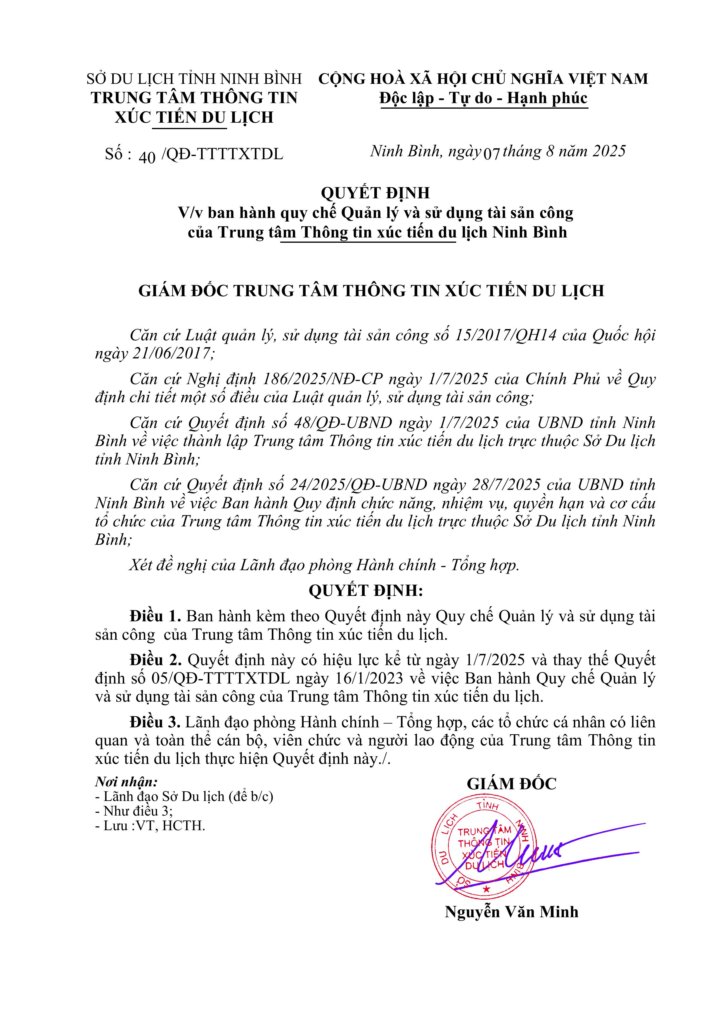 QUYẾT ĐỊNH V/v ban hành quy chế Quản lý và sử dụng tài sản công của Trung tâm Thông tin xúc tiến Au88 cơ hội giàu sang Ninh Bình