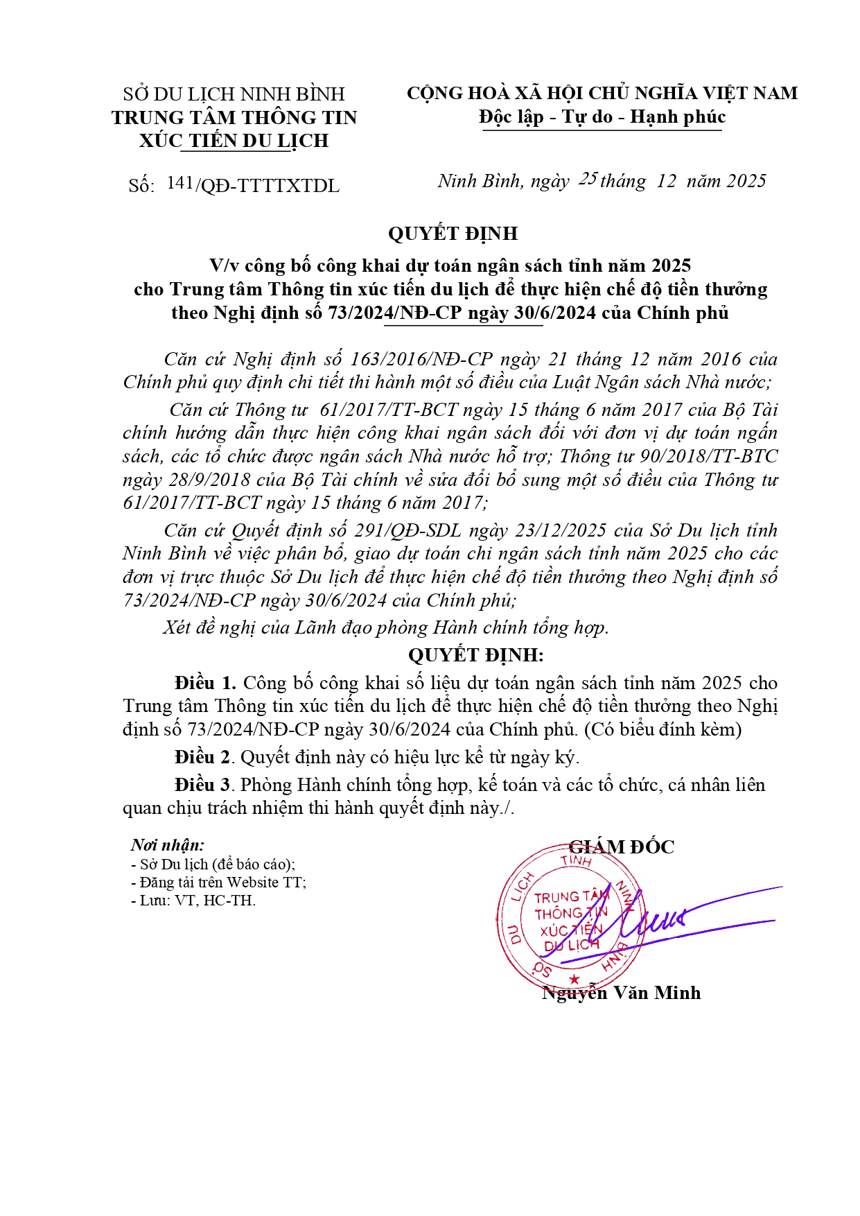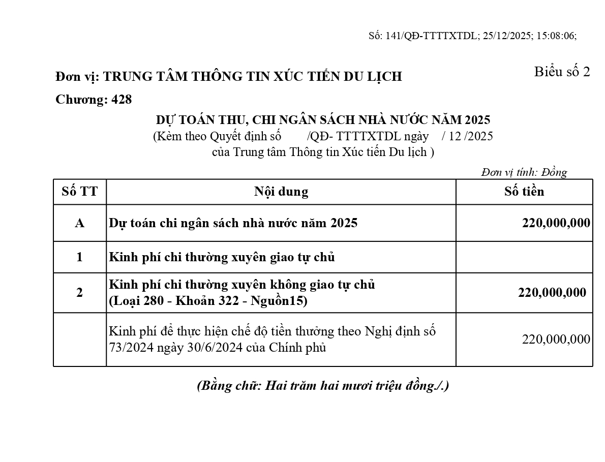 QUYẾT ĐỊNH V/v công bố công khai dự toán ngân sách tỉnh năm 2025 cho Trung tâm Thông tin xúc tiến Au88 cơ hội giàu sang để thực hiện chế độ tiền thưởng theo Nghị định số 73/2024/NĐ-CP ngày 30/6/2024 của Chính phủ