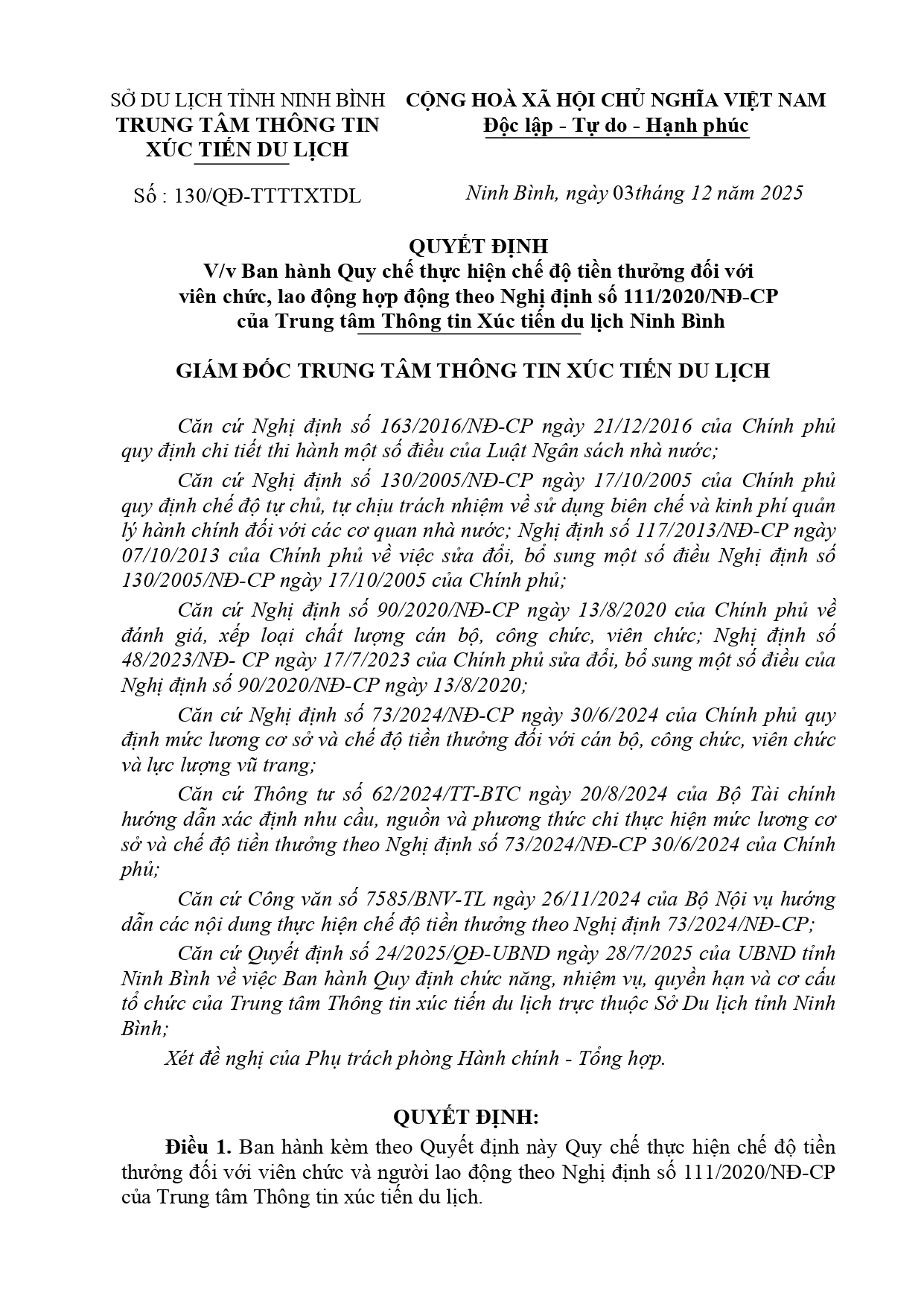 QUYẾT ĐỊNH V/v Ban hành Quy chế thực hiện chế độ tiền thưởng đối với viên chức, lao động hợp động theo Nghị định số 111/2020/NĐ-CP của Trung tâm Thông tin Xúc tiến Au88 cơ hội giàu sang Ninh Bình