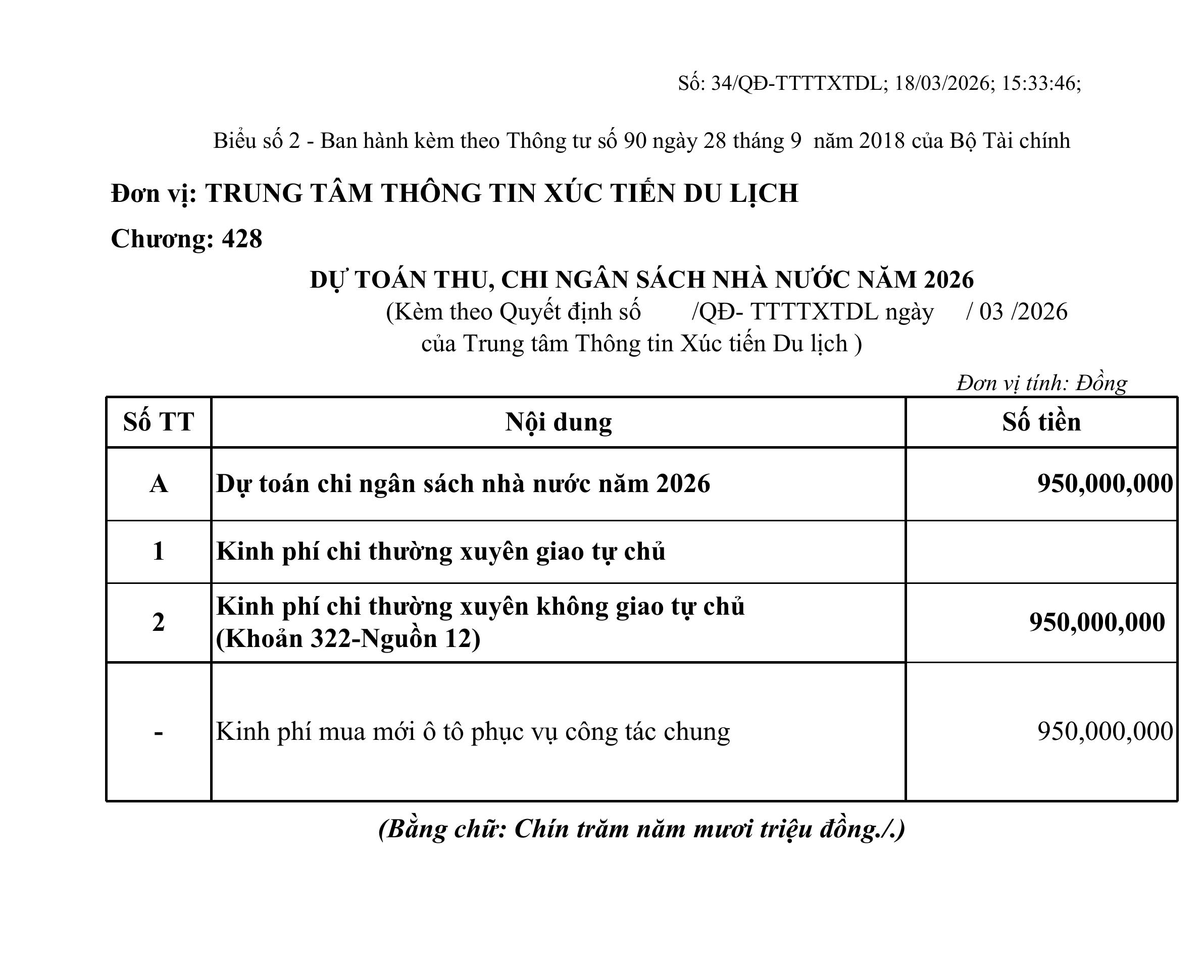 QUYẾT ĐỊNH V/v công bố công khai dự toán ngân sách nhà nước giao năm 2026 cho Trung tâm Thông tin xúc tiến Au88 cơ hội giàu sang