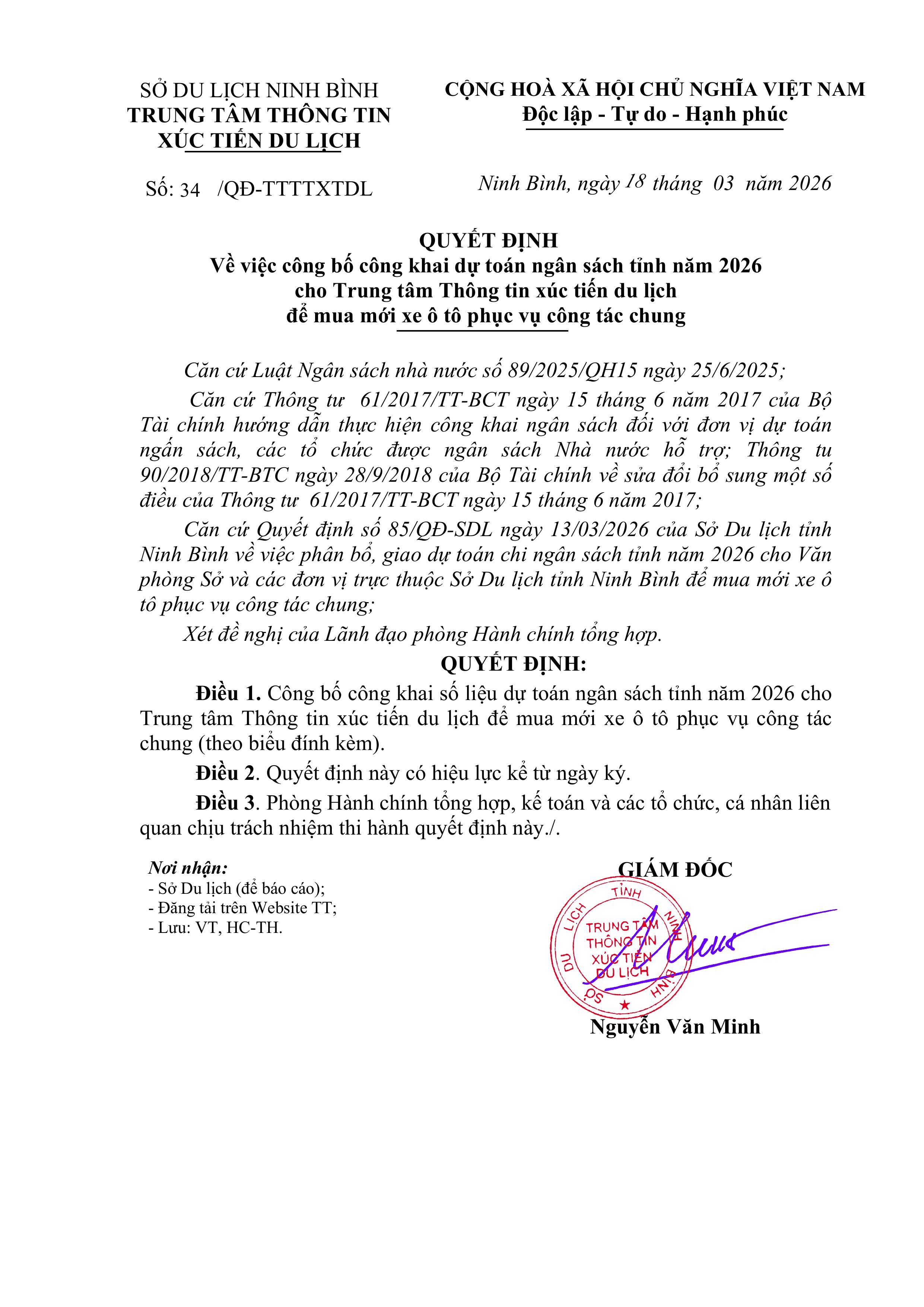 QUYẾT ĐỊNH Về việc công bố công khai dự toán ngân sách tỉnh năm 2026 cho Trung tâm Thông tin xúc tiến Au88 cơ hội giàu sang để mua mới xe ô tô phục vụ công tác chung