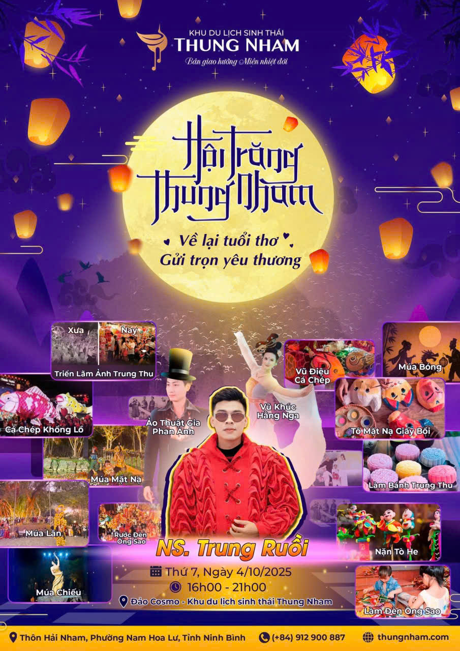 The program themed “Back to Childhood – Sending Love” will feature a variety of special activities such as lion dance, puppet shows, mask dance, Mid-Autumn photo exhibition, making star lanterns, toy figurines, mooncakes, and more. Audiences will also enjoy impressive artistic performances with the participation of comedian Trung Ruoi and magician Phan Anh. This will be a radiant festive night full of love and childhood memories. The event will take place from 4:00 PM – 9:00 PM, Saturday, October 4, 2025, at Cosmo Island – Thung Nham Ecotourism Area, Tay Hoa Lu Ward.