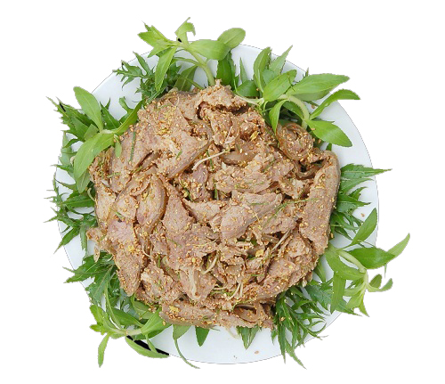 Les chèvres sont déplumées, grillées et dépouillées de chair (y compris la peau). Et puis, on les marine environ 10 minutes avec le pluchéa d’Inde et le basilic sacré. Il est un plat intéressant et typique de Ninh Binh. On mange le “tai de” avec la sauce de soja, le banane vert, le carambolier...