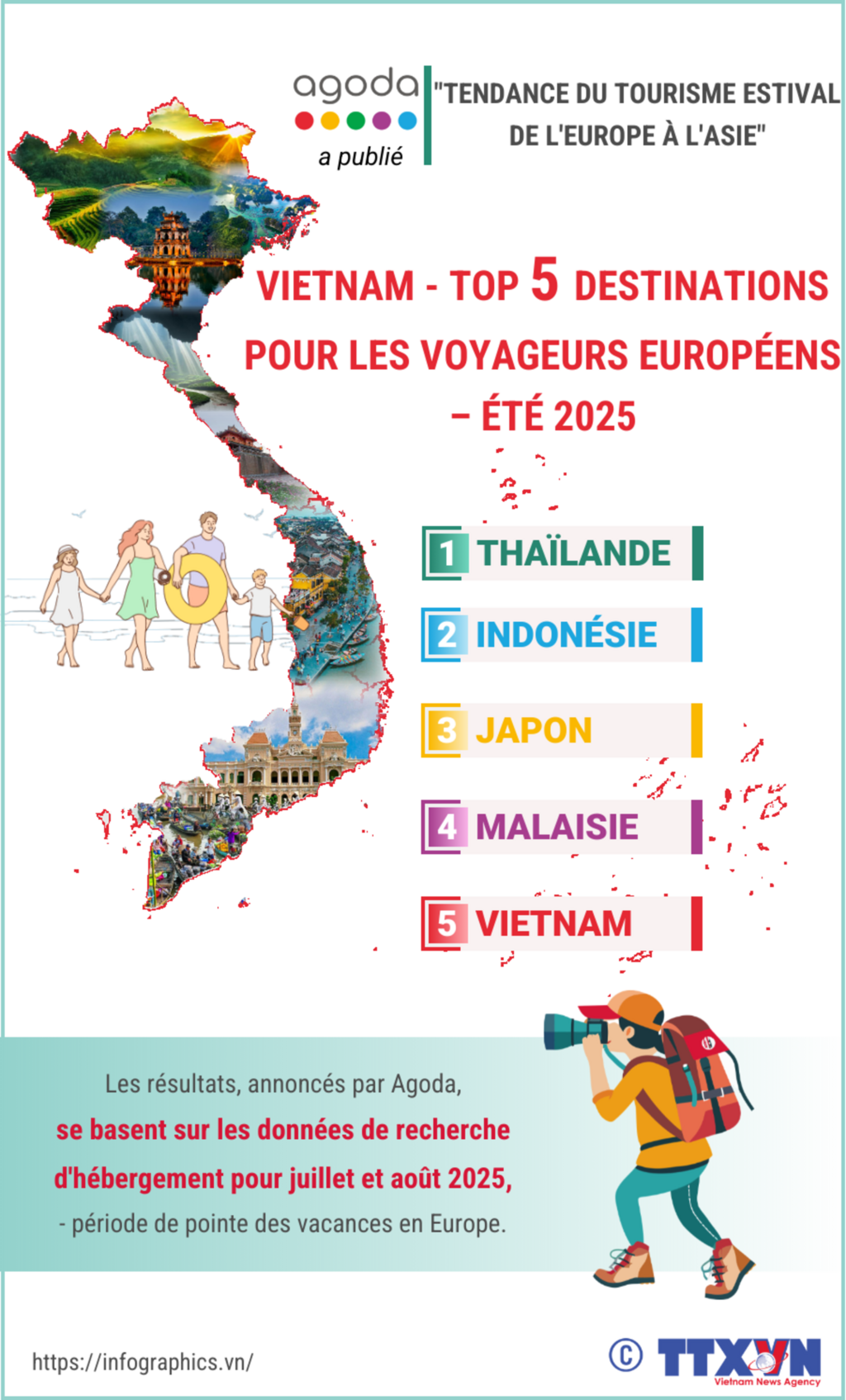 Selon la plateforme de voyage numérique Agoda, le Vietnam figure officiellement parmi les cinq destinations asiatiques les plus recherchées par les touristes européens pour l'été 2025. Cela confirme l’attractivité croissant du Vietnam sur la carte touristique estivale de l’Asie.