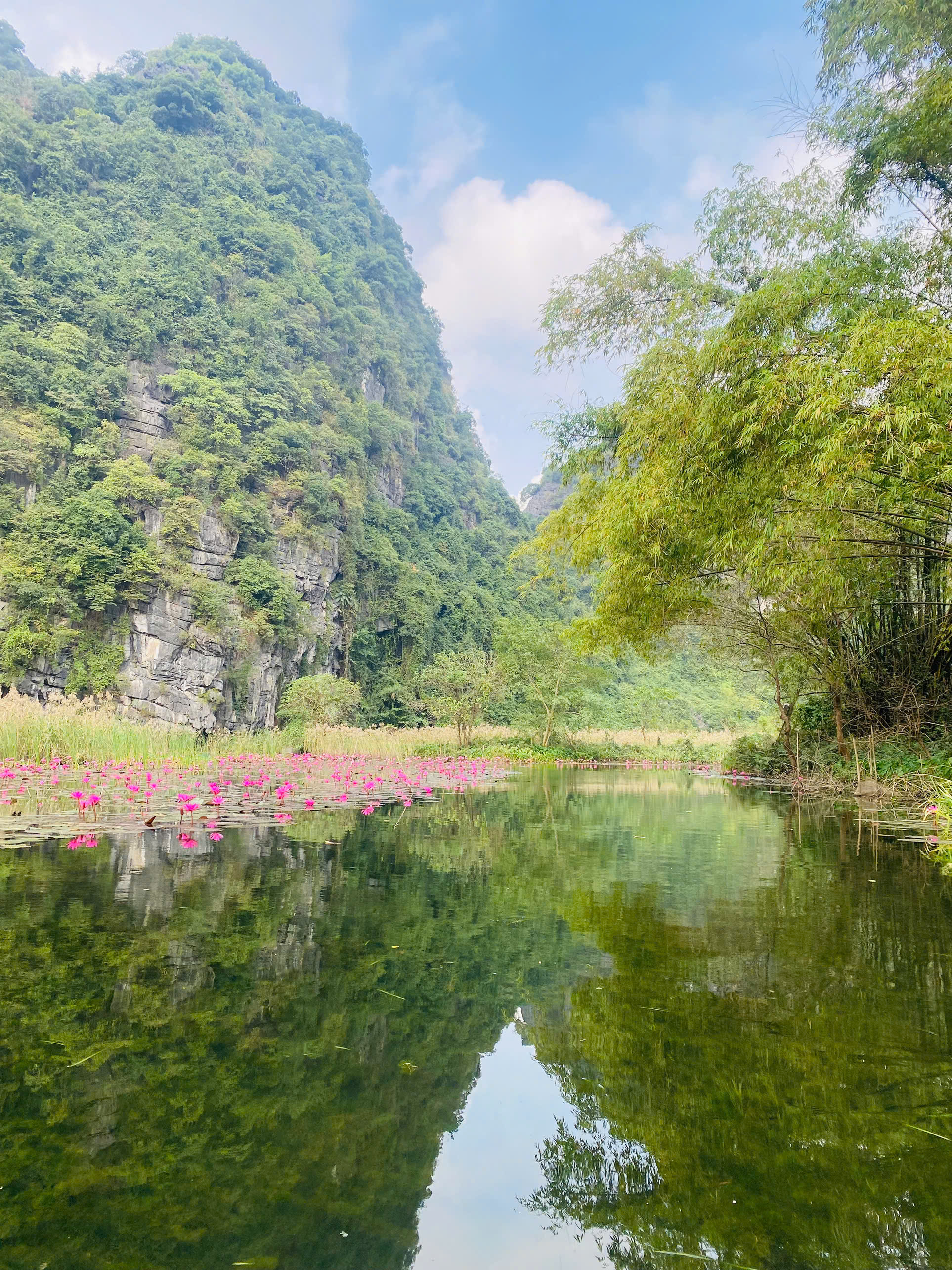 À bord d’une barque traditionnelle en bambou, guidée avec habileté par les habitants locaux, les voyageurs glissent doucement sur l’eau calme. Autour d’eux, se dressent des falaises majestueuses, couvertes de verdure, témoins silencieux du passage du temps. Le reflet du ciel bleu et des montagnes sur l’eau crée un jeu de miroirs fascinant, tandis que la brise légère transporte le parfum discret des fleurs. Ce moment suspendu, rythmé par le simple bruit des rames, offre une sensation profonde de paix et de sérénité.