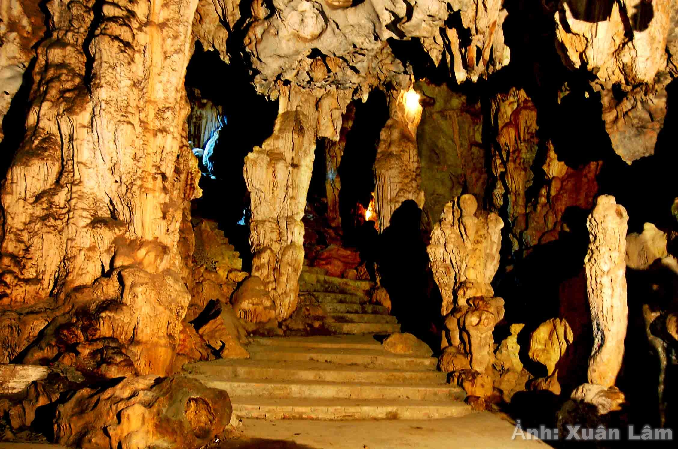 Đi hết động thờ Phật là đến hang Tối. Xung quanh hang và trần hang toàn là các nhũ đá, muôn hình vạn trạng, có chỗ lô xô như ngàn lớp sóng, vân nhũ đá như những đám mây ngũ sắc đang bay…Có thể nói đây là những kỳ quan thiên tạo. Đi hết hang Tối là đến hang Sáng. Ngay cửa hang có lối lên trời và lối xuống âm phủ đối diện nhau. Cửa lên trời gọi là cửa động con, lộ thiên ở tận đỉnh núi. Ánh sáng lùa vào làm hang sáng lên, nên gọi là hang Sáng. Lối xuống âm phủ sâu, cũng có nhiều thạch nhũ có hình dáng như: Tòa làu của Diêm Vương, thuồng luồng, ba ba, … Vì ở trên cao, cửa hang Sáng thắt lại, có khoảng lộ thiên, 3 hang lại thông với nhau nên khi có gió thổi mạnh, trong động phát ra âm thanh nghe như tiếng sáo. Động chính là cái sáo đá khổng lồ của tạo hóa, ngàn năm vi vu giữa đất trời.