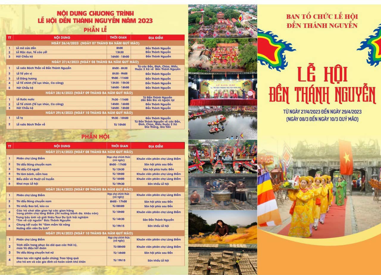 Ngày 07/4/2023, UBND huyện Gia Viễn đã ban hành kế hoạch số 51/KH-UBND về việc tổ chức lễ hội Đền Thánh Nguyễn năm 2023. Theo đó lễ hội Đền Thánh Nguyễn năm 2023 được tổ chức từ ngày 27 đến ngày 29/4/2023 tức ngày 08/3 đến ngày 10/3 năm Quý Mão.